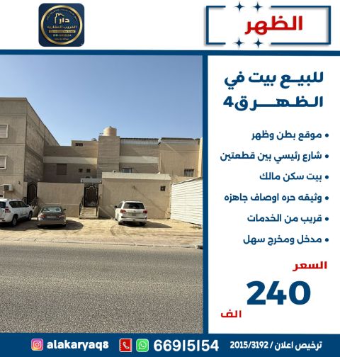 For sale: A house in Al-Dhahr, located in a prime position with front and back access on a main street, between two residential plots. Owner-occupied, freehold title, ready specifications, close to services, easy entry and exit. Price: 240,000 KWD.