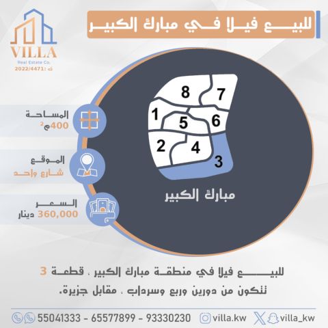 For sale, a villa in Mubarak Al-Kabeer area, plot 3, area 400 sqm, located on a single street, consisting of two floors, a quarter floor, and a basement, opposite an island. Price 360,000 Kuwaiti dinars. For inquiries, mobile 1, mobile 2, mobile 3.