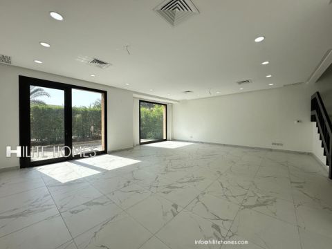 الطابق الأرضي غرفة معيشة فسيحة، حمام ضيوف، مطبخ، ديوانية، حديقة. الطابق الأول ثلاث غرف نوم مع غرفتي نوم رئيسيتين، اجمالي ثلاثة حمامات. الطابق السفلي غرفة تخزين، قاعة فسيحة، غرفة خادمة، غرفة سائق. الإيجار 1800 دينار كويتي