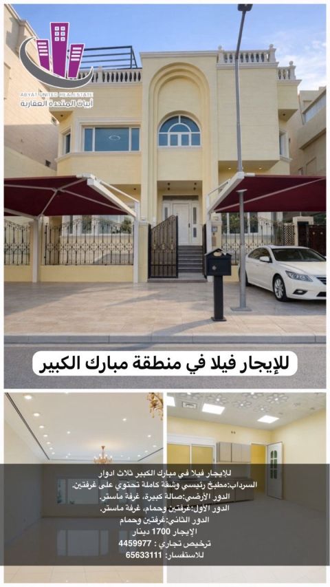 للإيجار: فيلا في مبارك الكبير مكونة من ثلاثة أدوار. يحتوي السرداب على مطبخ رئيسي وشقة كاملة تحتوي على غرفتين. الدور الأرضي به صالة كبيرة وغرفة ماستر. الدور الأول به غرفتين وحمام وغرفة ماستر. الدور الثاني به غرفتين وحمام. الإيجار 1700 دينار. الترخيص التجاري: 4459977. للاستفسار، اتصل بشركة أبيات المتحدة العقارية.