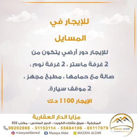 For rent: A ground floor apartment in the Al-Masayel suburb, consisting of 2 master bedrooms, 2 bedrooms, a living room with its own bathroom, a fully equipped kitchen, and 2 parking spaces. For serious inquiries only, no brokers allowed. Rent is 1100 dinars. For inquiries, contact via mobile.
