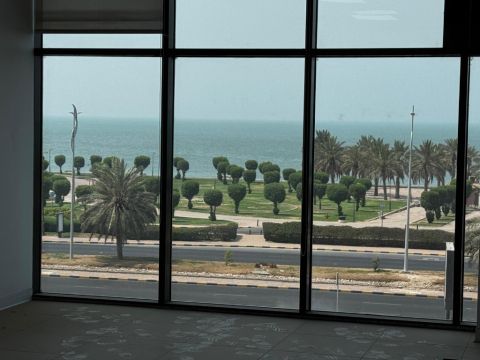 للإيجار: مكتب فاخر بمساحة 160 متر مربع وإطلالة بحرية رائعة. مقسم وجاهز لأكثر من 7 مكاتب ومنطقة استقبال. يشمل 3 تراخيص ومواقف سيارات خاصة مظللة. الديكورات متوفرة. فترة سماح شهر واحد فقط. للجادين فقط.