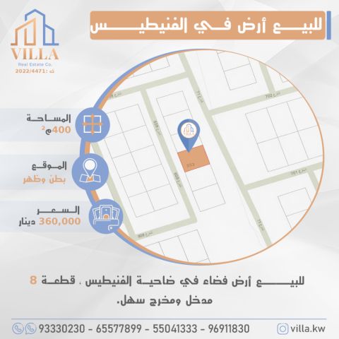 للبيع: أرض فضاء في ضاحية فنيطيس، قطعة 8، المساحة 400 متر مربع، الموقع بطن وظهر، مدخل ومخرج سهل. السعر 360,000 دينار كويتي. للاستفسار، نقال 1، نقال 2، نقال 3، نقال 4.