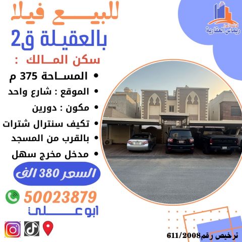 للبيع فيلا في منطقة العقيلة، مساحتها 375 متراً مربعاً، تقع على شارع واحد، تتكون من وحدتين، مع تكييف مركزي. الفيلا نظيفة جداً، مملوكة للساكن، سهولة الوصول، قريبة من الخدمات، ومدخل ومخرج سهل. السعر 380,000. الطابق الأرضي يحتوي على ديوانية خارجية وحوش، وديوانية مع حمام ومغاسل، وصالة مع حمام ومغاسل، وغرفتين، ومطبخ، وغرفة خادمة. الطابق الأول يحتوي على ثلاث غرف نوم ماستر، وصالة، ومطبخ.