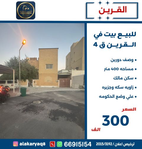 للبيع: بيت في القرين، المنطقة 4، مساحة 400 متر مربع، دورين سكن، مالك، زاوية وجزيرة، على وضع الحكومة، السعر 300 ألف دينار كويتي.