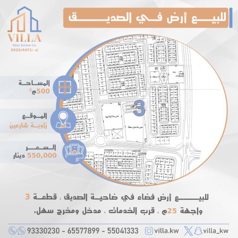 للبيع أرض فضاء في ضاحية الصديق، قطعة 3، المساحة 500 متر مربع، الموقع زاوية شارعين، واجهة 25 متر، قرب الخدمات، مدخل ومخرج سهل. السعر 550,000 دينار كويتي. للاستفسار، نقال 1، نقال 2، نقال 3.