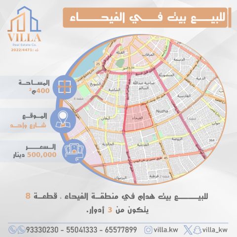 للبيع: بيت هدام في منطقة الفيحاء، قطعة 8، المساحة 400 متر، الموقع شارع واحد، يتكون من 3 أدوار. السعر: 500,000 دينار كويتي. للاستفسار، اتصل على: 1، 2، 3.