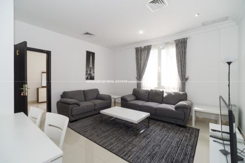 A semi-furnished apartment in Bneid Al-Qar, Kuwait - one bedroom, one bathroom, living room, kitchen, hall. Sunny. Area includes a gym and lobby. For rent to foreign residents only. Rent is 380 Kuwaiti Dinars per month, electricity not included. Please contact Horizon Q8 Real Estate Company. A one-month rental deposit and real estate fees equivalent to half a month's rent apply. Map location for guidance purposes.