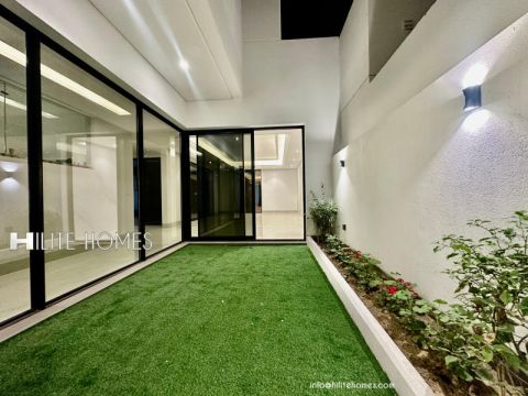 A brand new villa consisting of 4 master bedrooms with a private pool for rent in Abu Fatira. The ground floor contains a spacious living area with a courtyard, guest bathroom, large kitchen, private pool, and outdoor garden. The first floor has a living room, four master bedrooms with separate wardrobe areas, a balcony, and a small kitchen. The second floor includes a maid's room with a bathroom, laundry area, storage room, rooftop area, elevator, and six parking spaces. The rent is 2800 Kuwaiti Dinars.