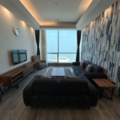 Furnished apartment for rent in Mahboula Block 2 Private location with sea views, excellent finishing, consisting of a living room, kitchen, 2 bedrooms, including one master bedroom, 2 bathrooms, surveillance cameras, security, a swimming pool, a gym, a lobby, internet, a cinema, football field, a basketball court, billiards, children'games, private parking, and a cleaning service. Includes water