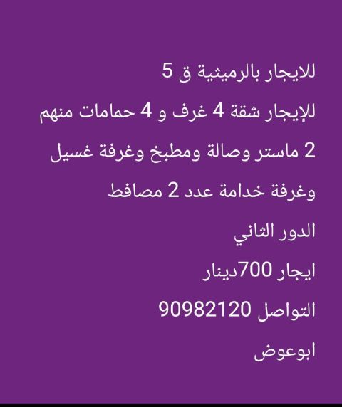 للإيجار في الرميثية، قطعة 5: شقة للإيجار مكونة من 4 غرف نوم و4 حمامات، منها 2 غرفة نوم رئيسية، وصالة، ومطبخ، وغرفة غسيل، وغرفتين للعمالة المنزلية. تقع في الدور الثاني. الإيجار 700 دينار كويتي. للتواصل: أبو عوض.