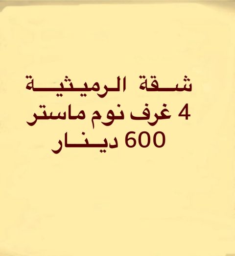 For rent, an apartment in Al - Rumaithiya, super deluxe, consisting of 4 master bedrooms, a living room with a guest bathroom, a maid's room with its own bathroom, a fully equipped kitchen, and two shaded parking spaces. There is a yard. The rent is 600 dinars final. For inquiries