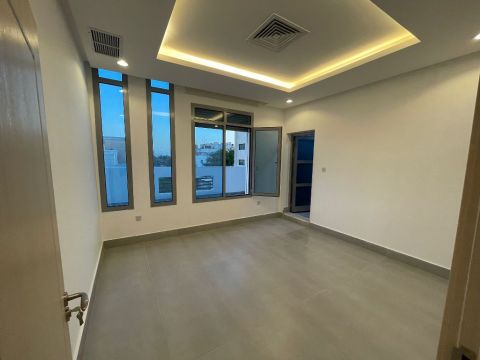 For rent in Al - Rumaithiya, deluxe furnished apartment with 3 bedrooms, including 1 master bedroom, a maid's room with its own bathroom, a large living room with a guest bathroom, a fully equipped kitchen, 4 bathrooms, an elevator, ceramic tiles, central air conditioning, satellite TV, a central filter and water heater, car parking spaces, and a large yard. rent is 450 dinars + agency commission