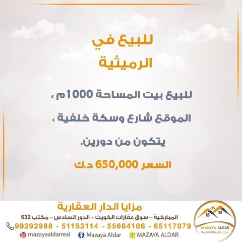 For sale: A house in the Rumaithiya area with an area of 1000 square meters. The location is on a street with a back alley. It consists of two floors. For serious buyers only, and brokers are prohibited. The price is 650,000 dinars. For inquiries, contact via mobile.