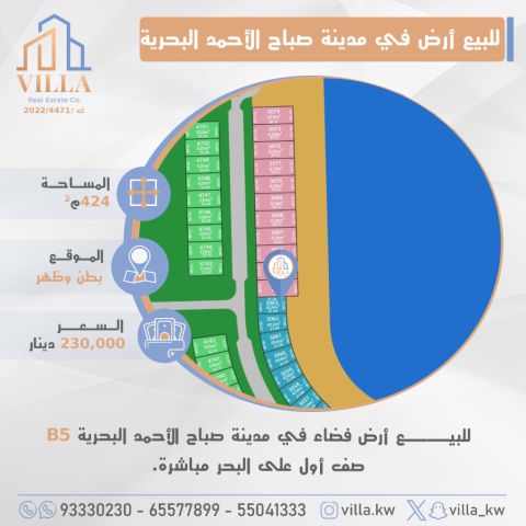 للبيع أرض فضاء في مدينة صباح الأحمد البحرية - B5، المساحة 424 متر مربع، الموقع بطن وظهر، صف أول على البحر مباشرة. السعر 230,000 دينار كويتي. للاستفسار، نقال 1، نقال 2، نقال 3.