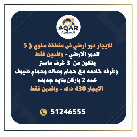 للإيجار: شقة بالدور الأرضي في منطقة سلوى، قطعة 5. الدور الأرضي مخصص للوافدين فقط. تتكون من 3 غرف نوم ماستر، وغرفة خادمة مع حمام، وصالة، وحمامين للضيوف. يوجد موقفان للسيارات. البناية جديدة. الإيجار 430 دينار كويتي، للوافدين فقط.