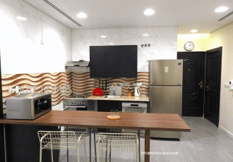 For rent in Salwa, Block 7, a first-floor apartment consisting of 4 rooms, all master bedrooms with a balcony, a maid's room with a bathroom, a fully equipped kitchen, and an isolated living room served by a guest bathroom. The apartment is renovated with air conditioning, a water heater, an exhaust fan, central satellite, super deluxe finishing, an elevator, and 2 shaded parking spaces. Rent is 650 dinars.