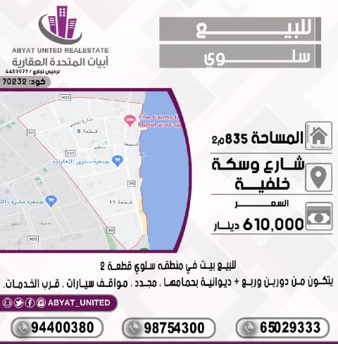 للبيع: بيت في منطقة سلوى، قطعة 2. الموقع: شارع وسكة خلفية. المساحة: 835 متر مربع. يتكون من دورين وربع، ديوانية بحمامها، مجدد، مواقف سيارات، قرب الخدمات. للاستفسار، النقال رقم 1، النقال رقم 2، النقال رقم 3. السعر: 610 ألف دينار. الكود: 70232.
