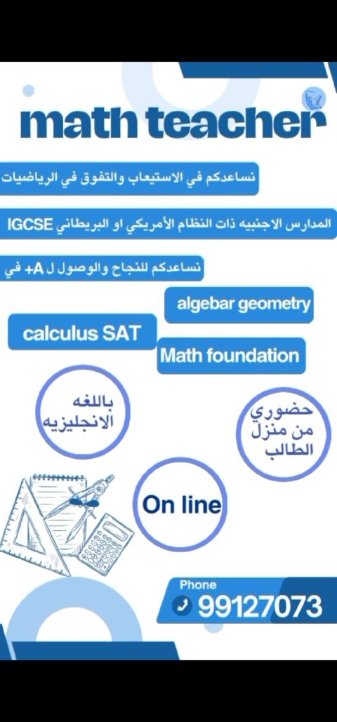 A professor from the Levant teaches foreign mathematics subjects Mathematics, Algebra, Geometry, Calculus, and IGCSE. The explanation is entirely in English. The subjects include Geometry, Algebra, Pre - Algebra Mathematics, AP Calculus, Geometry for schools AAG, BBS, ASK, KBS, NES, UAS, Dasman, Al - Ru'ya, Integration, and university subjects SAT, Mathematics 110, College Algebra. Lessons are conducted