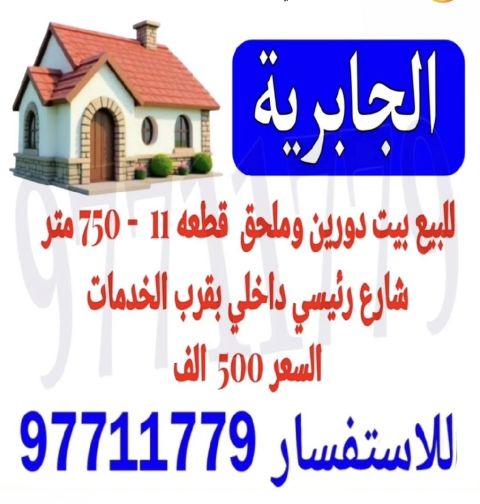 للبيع بيت في الجابرية مساحة 750 متر مربع. يقع على شارع رئيسي داخلي واحد مؤجر حاليا ب 1780 دينار، مع امكانية الاخلاء. قريب من الخدمات السعر 500000 دينار. للاستفسار