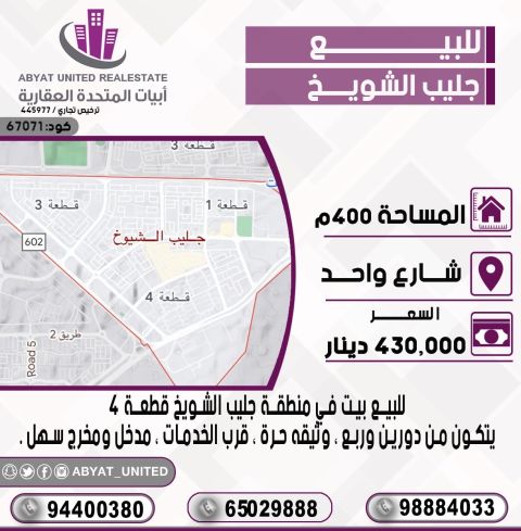 للبيع: بيت في منطقة جليب الشويخ، قطعة 4، بمساحة 400 متر مربع. الموقع على شارع واحد، يتكون من دورين وربع، وثيقة حرة، قرب الخدمات، ومدخل ومخرج سهل. للاستفسار، اتصل على النقال 1، النقال 2، النقال 3. السعر: 430 ألف دينار. رقم الكود: 67071.