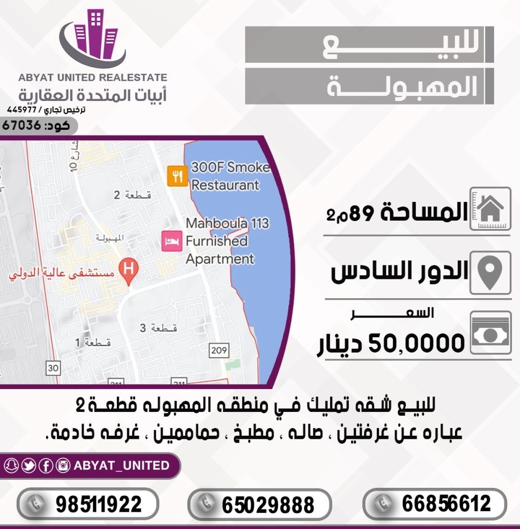 For sale: An owned apartment in the Al-Mahboula area, Plot 2, 6th floor, area 89 m², consisting of two bedrooms, a living room, a kitchen, two bathrooms, and a maid's room. For inquiries, mobile 1, mobile 2, mobile 3 - Price 50 thousand dinars - Code number 67036.