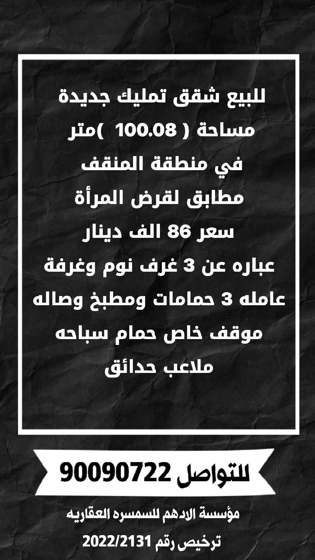 For sale: New ownership apartments with an area of 100.08 square meters in the Al-Mangaf area, compliant with the women's loan. Price: 86,000 dinars. Features: 3 bedrooms, a maid's room, 3 bathrooms, a kitchen, a living room, private parking, a swimming pool, playgrounds, and gardens. Al-Adham Real Estate Brokerage, license number 2022/2131.