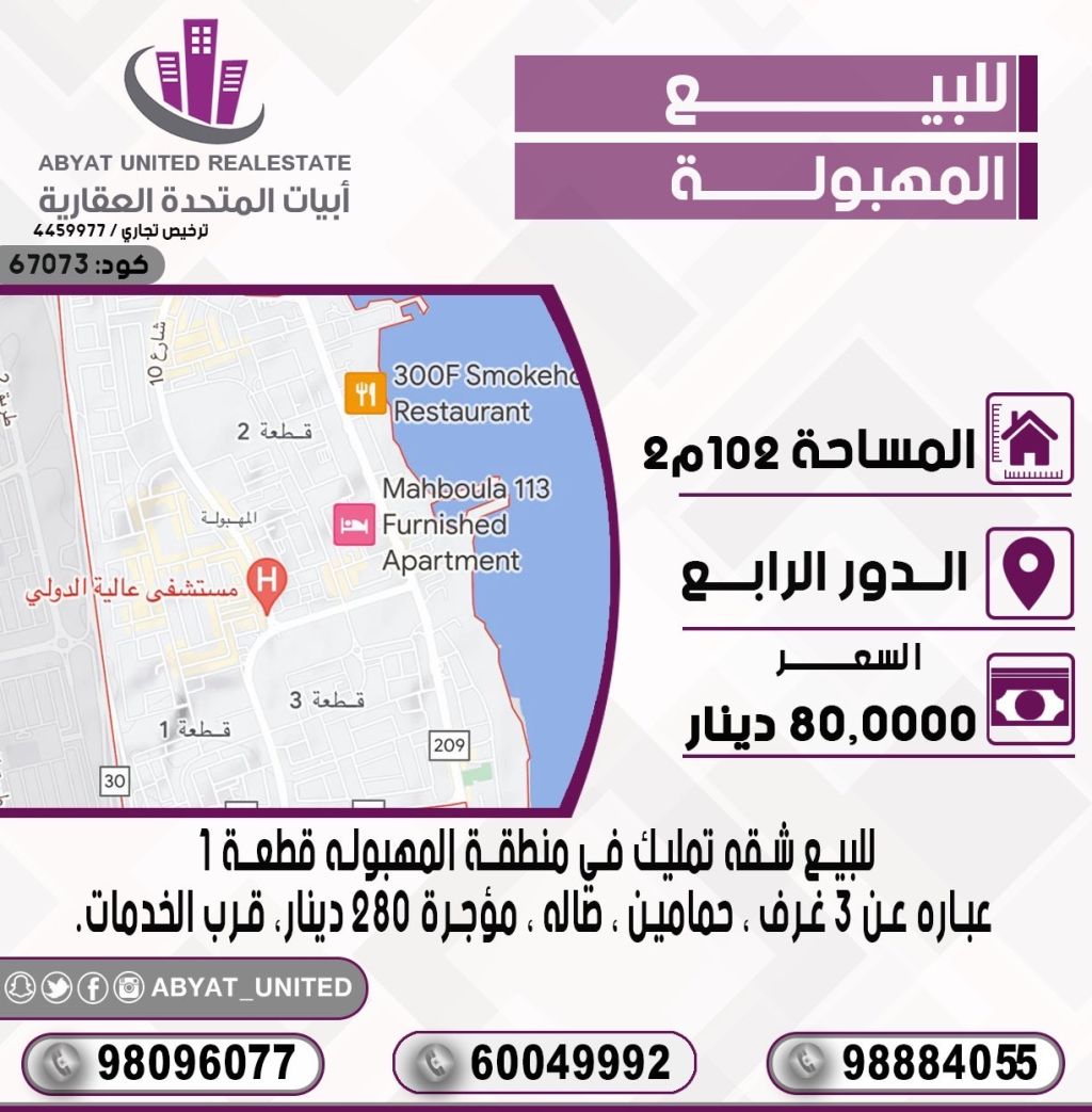 For sale: An owned apartment in the Al-Mahboula area, Plot 1, 4th floor, area 102 m², consisting of 3 rooms, 2 bathrooms, a hall, rented for 280 dinars, near services. For inquiries, mobile 1, mobile 2, mobile 3 - Price 80 thousand dinars - Code number 67073.
