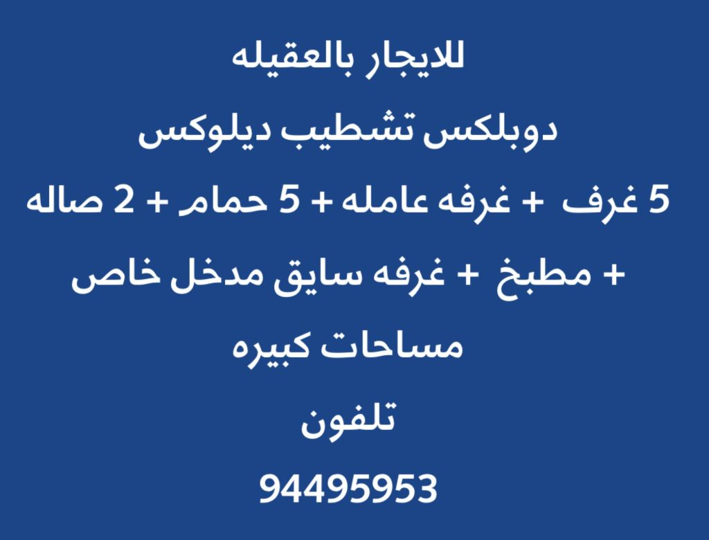 للإيجار: دوبلكس بمدخل خاص وتشطيب ديلوكس في العقيلة. يحتوي على 5 غرف منها 1 ماستر وغرفة عاملة، و5 حمامات. يشمل صالة، مطبخ وغرفة سائق بمساحات كبيرة.
