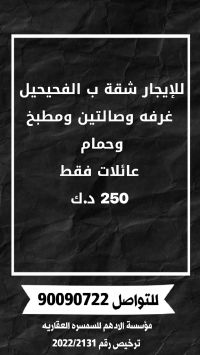 للإيجار شقة في الفحيحيل بغرفة وصالتين ومطبخ وحمام. عائلات فقط. 250 دينار كويتي. للتواصل.