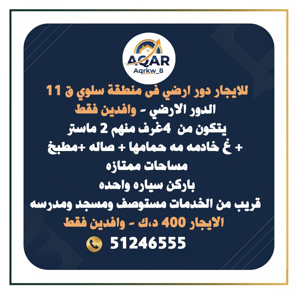 للإيجار: شقة في الدور الأرضي في منطقة سلوى، القطعة 11. الدور الأرضي - وافدين فقط. تتكون من 4 غرف، منها 2 غرفة نوم رئيسية + غرفة خادمة مع حمامها الخاص + صالة + مطبخ. مساحات ممتازة. موقف سيارة واحد. قريبة من الخدمات: مستوصف ومسجد ومدرسة. الإيجار: 400 دينار كويتي. وافدين فقط.