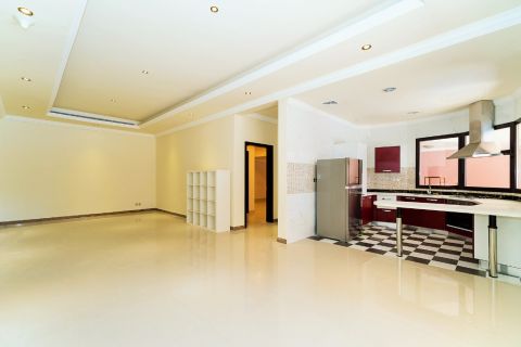 For rent in Fintas, Block 6, a second-floor apartment, new, first occupant. It consists of 3 bedrooms, including a master bedroom and two other bedrooms served by a bathroom, a maid's room with a bathroom, a fully equipped kitchen, and an isolated living room. Spacious and distinguished areas, super deluxe finishing, elegant, with air conditioning, satellite, water heater, central exhaust, shutter, shower box, elevator, shaded parking spots nearby. Rent: 660 dinars.