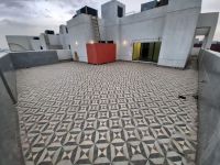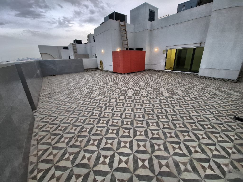 For rent in Fintas Block 3, a luxurious rooftop apartment with a beautiful view, consisting of two bedrooms including one master bedroom, a fully equipped kitchen, a maid's room with a bathroom, a living room, a large balcony, and two parking spaces. The rent is 400 KD.