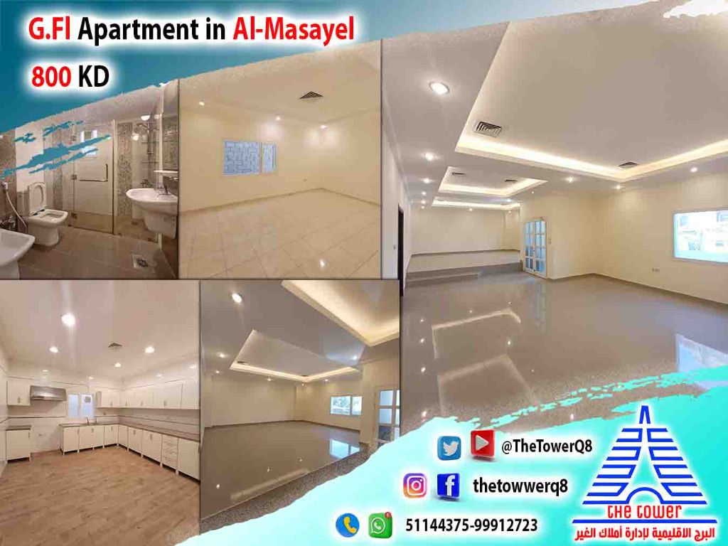 For rent in Al-Masayel, a ground floor apartment with a private entrance - deluxe finishing - large spaces - easy access - 4 bedrooms (including two master bedrooms and two bedrooms sharing a bathroom) - a large living room with a guest bathroom - a maid's room with a bathroom - a large, equipped kitchen - shaded parking. Rent is 800 KWD. For inquiries.