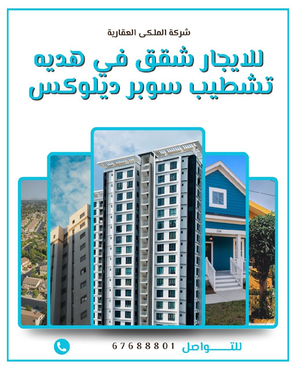 For rent: An apartment in Hadiya with super deluxe finishing, 3 bedrooms, 4 bathrooms, a hall, a kitchen, and a master bedroom. Features include electric shutters, 2 elevators, private parking, and 24-hour surveillance cameras. Rent is 450 Kuwaiti Dinars.