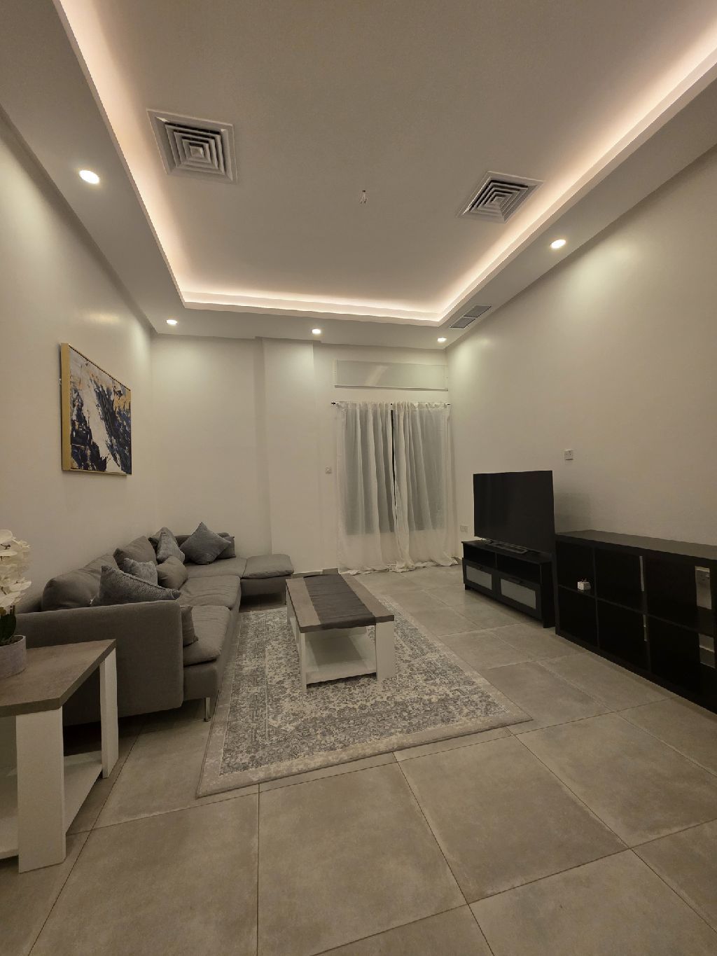 For rent: a brand new, fully furnished 3-bedroom apartment in Fnaitees. It includes a living room, one master bedroom, two standard bedrooms, a bathroom, and a kitchen. Rent is KD 600 plus a deposit and a half-month commission.