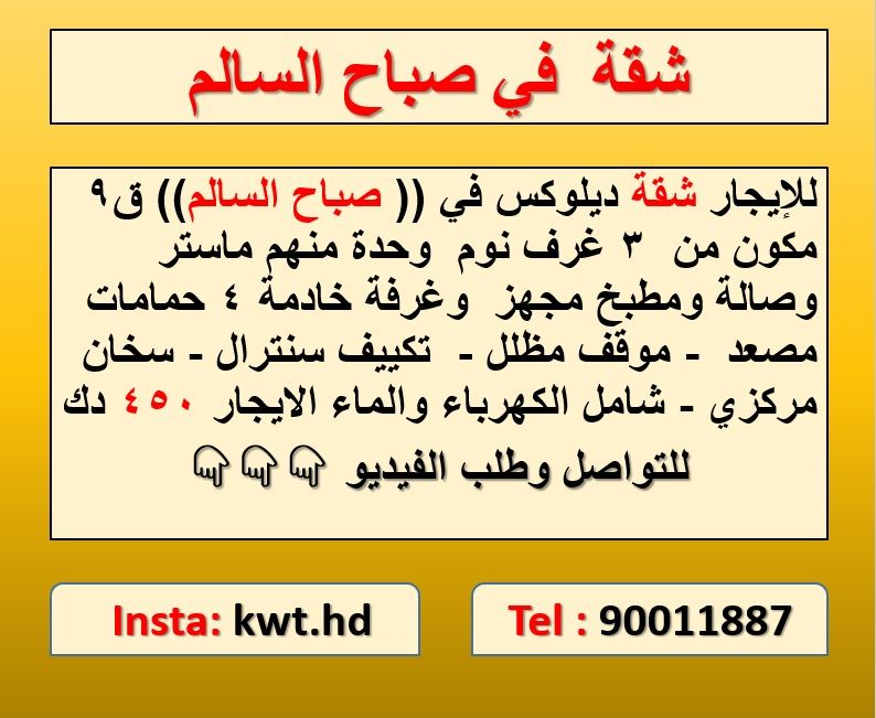 For rent A deluxe apartment in Sabah Al Salem, Block 9, opposite the cooperative society branch. It features 3 bedrooms (one of them is a master bedroom) a living room, a fully equipped kitchen, a maid's room, and 4 bathrooms. Amenities include an elevator, shaded parking, central air conditioning, central heating, and the rent covers electricity and water. The rent is 450 Kuwaiti Dinars. For contact