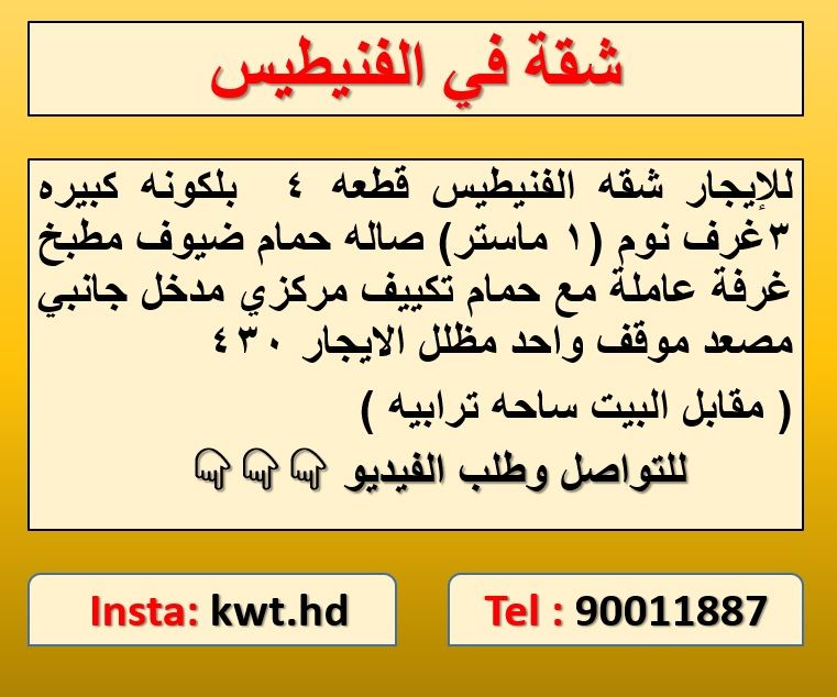 For rent, an apartment in Fintas with deluxe finishing and spacious areas. It consists of 3 bedrooms, 1 master bedroom, a maid's room with its own bathroom, a large living room, and a fully equipped kitchen. It has an elevator and a parking space. The rent is 430. For communication and to request a video