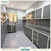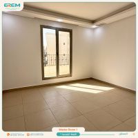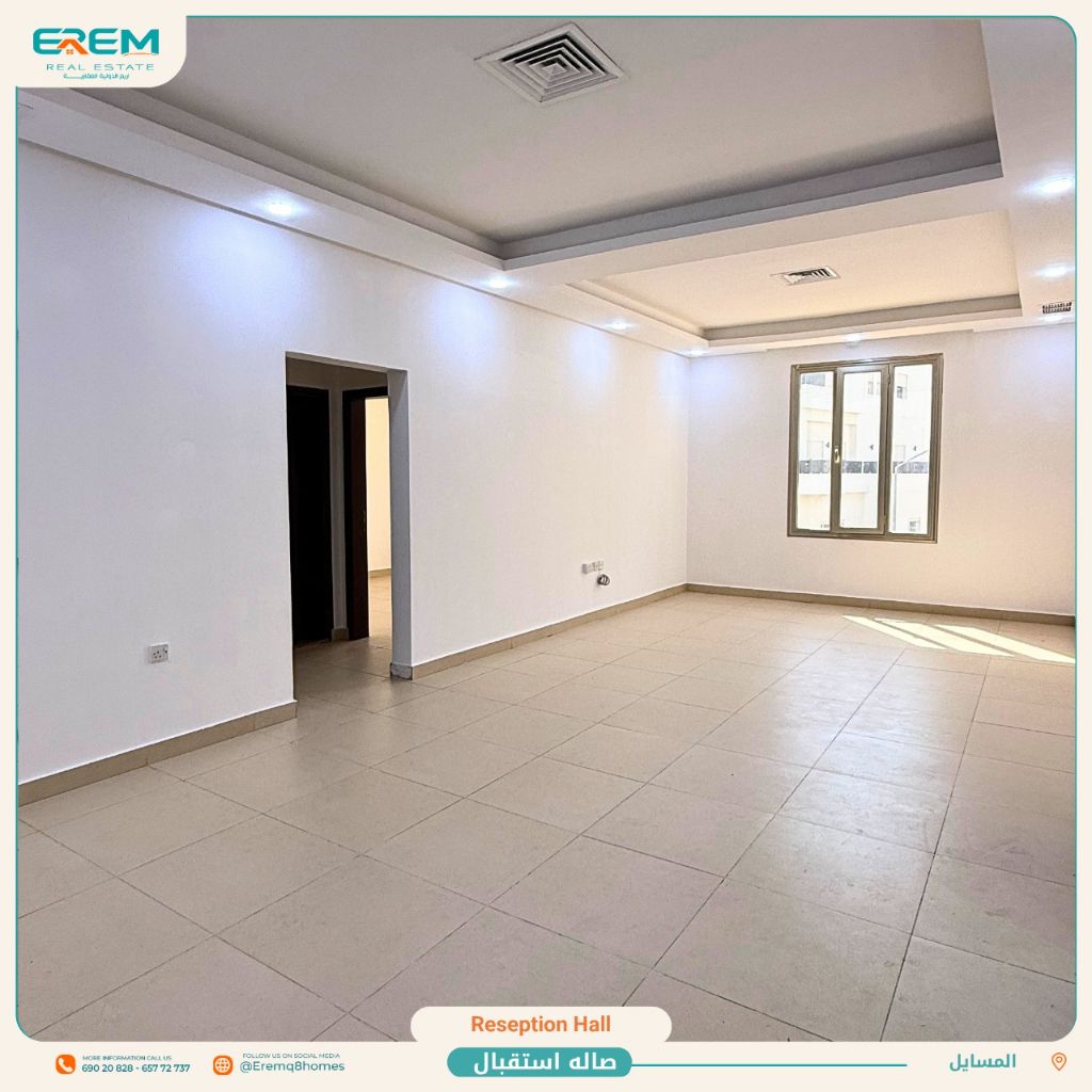 For rent in Al-Masayel, an apartment with balconies, super deluxe finishing, consisting of a hall, 3 rooms including a master, a kitchen, a maid's room with a bathroom, and shaded parking. The rent is 500 KWD.