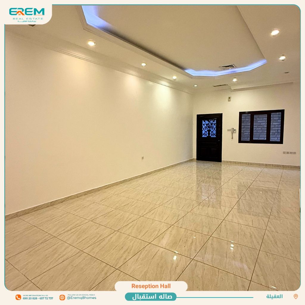 For rent in Aqeela, an apartment with a courtyard, super deluxe finishing. It consists of a living room with a guest bathroom, 3 bedrooms including a master bedroom, a kitchen, a laundry room, and a maid's room with a bathroom. 3 covered parking spaces. Rent is 500 KWD.