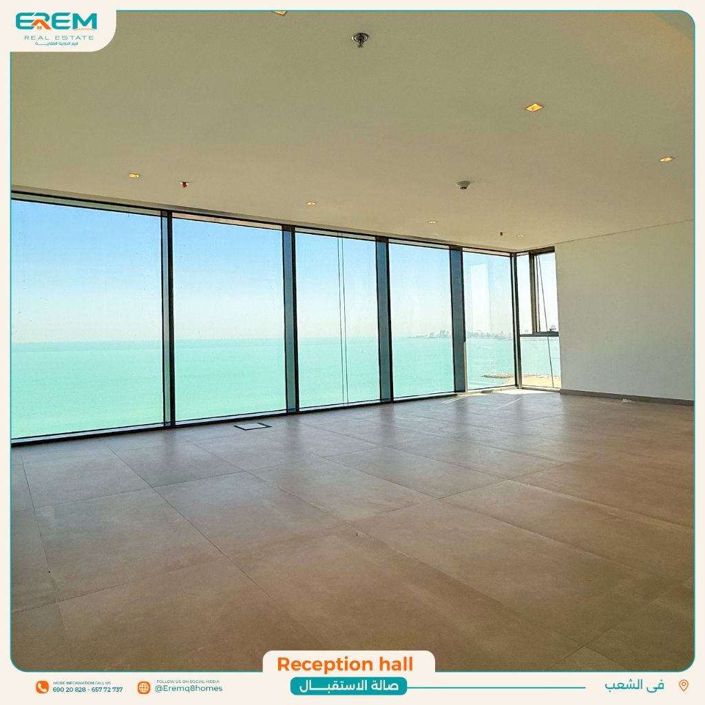 For rent in 'Al Sha'ab Al Bahri', an apartment with a direct sea view and a very prime location. The apartment is semi-furnished with new deluxe finishing. It consists of a reception hall, 3 master bedrooms with wardrobes, a fully equipped kitchen, a maid's room, 2 shaded parking spaces, and community services including internet, gym, indoor and outdoor swimming pools, children's play area, and a business area. The rent starts from 1100 to 1250 KD.
