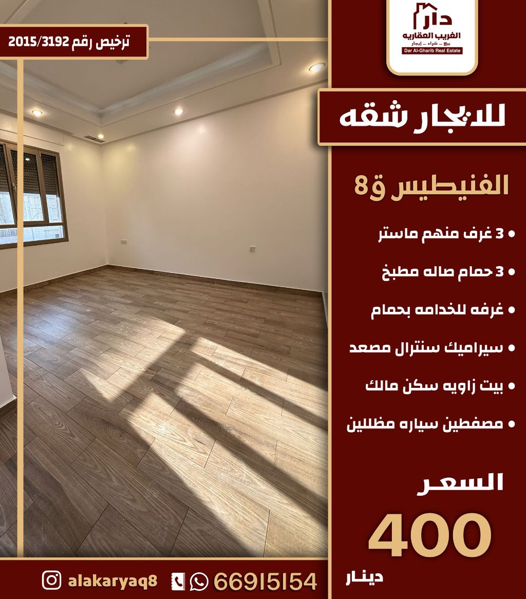 For rent in Fintas, a corner house apartment with 3 bedrooms including a master bedroom, a living room, a fully equipped kitchen, a maid's room with a private bathroom, ceramic flooring, central air conditioning, an elevator, two shaded car parking spaces. Rent is 400 dinars.