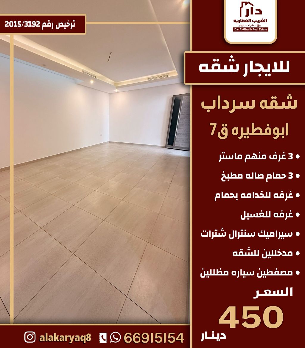 For rent: An apartment in Abu Fatira, basement level, with two entrances including a private entrance. It has 3 bedrooms including a master bedroom, 3 bathrooms, a living room, a kitchen, a maid's room, a laundry room, and two shaded and covered car parking spaces. The rent is 450 dinars.