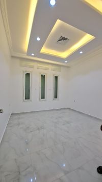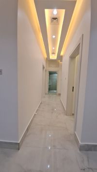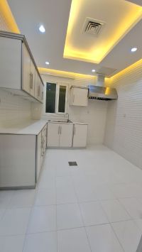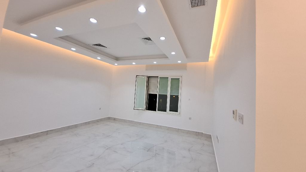 In Fintas, Block 1, a modern apartment with a mezzanine, located on two streets, one of which is a main street near Chart 30. It consists of 3 rooms, including a master bedroom and two rooms with a bathroom between them, a living room, a balcony with shutters opening to the street, a maid's room with a bathroom, a fully equipped kitchen, two parking spaces, some covered, and a gym. Rent is 550 KD.