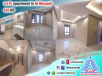 For rent in Al-Masayel, a first-floor apartment - Super Deluxe finishing - Opposite a mosque - 3 bedrooms (including a master bedroom with an ensuite bathroom and two bedrooms sharing a bathroom) - Maid's room with a bathroom - Equipped kitchen - Covered parking. Rent is 430 KD. For inquiries.