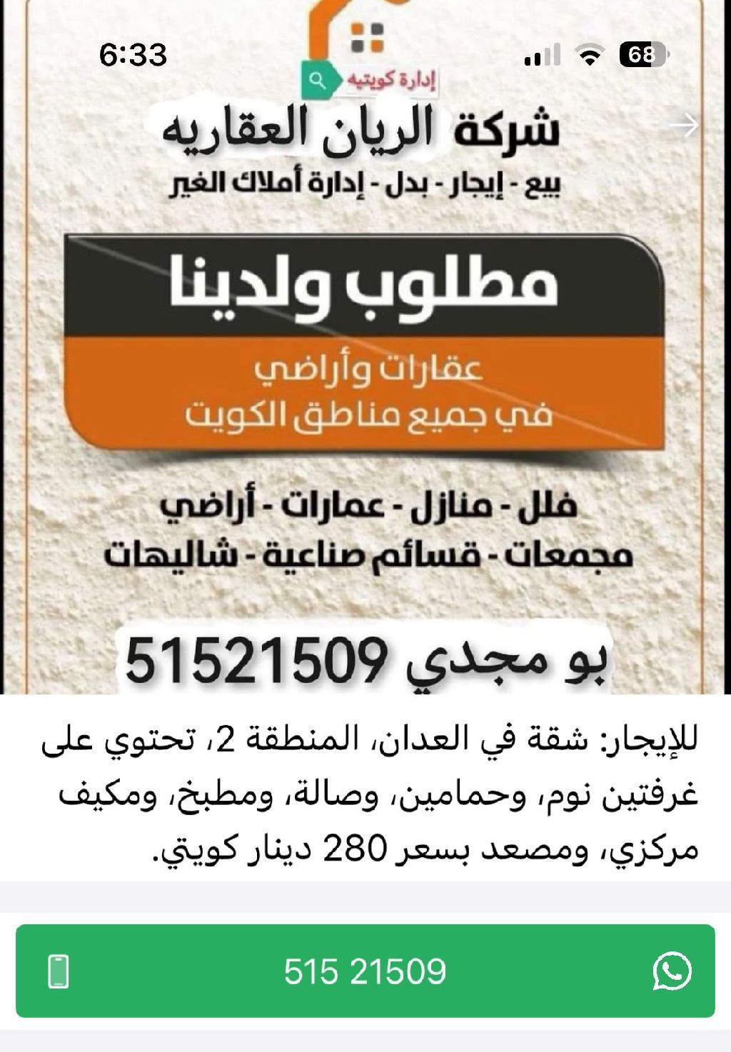 For rent: An apartment in Fintas, Area 6, with 3 bedrooms including one master bedroom and two bedrooms sharing a bathroom, a living room, a kitchen, and a maid's room with its own bathroom. It includes an elevator, central air conditioning, a water heater, a water filter, and central satellite. The rent is 350 KD with a 200 KD security deposit.