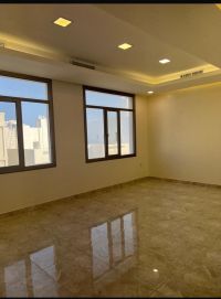 For rent: A large apartment in Abu Fatira, first floor with elevator, deluxe finishing. It consists of 4 bedrooms, including 3 master bedrooms, two living rooms (one large main living room and a second dining living room), guest bathroom, equipped kitchen, maid's room with its own bathroom, two large car parking spots in the basement, and a side yard next to the house. Rent: 550 KD. For contact.