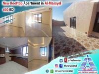 For rent in Al-Masayel - Apartment with private roof - New high-end finishing - First occupant - 3 bedrooms (including a master bedroom - two rooms share a bathroom) - Large living room - Equipped kitchen - Covered parking. Rent 600 KD. For inquiries.