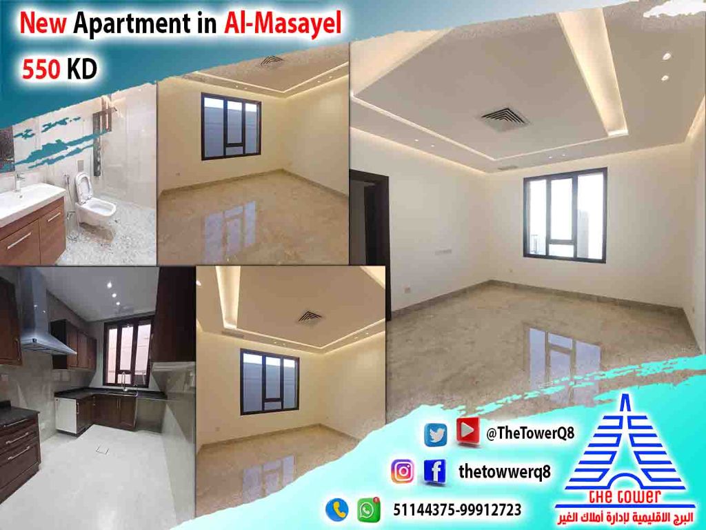For rent in Al-Masayel - New luxury finishing apartment - First occupant - 3 bedrooms (including a master bedroom - two rooms share a bathroom) large living room - maid's room with bathroom - equipped kitchen - shaded parking. Rent 550 KD. For inquiries.