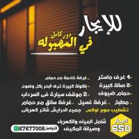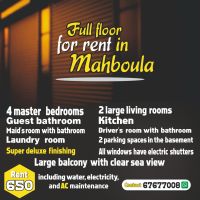 For rent: Full floor - Al-Mahboula, super luxury finishing, 4 master bedrooms, 2 large living rooms, guest bathroom, kitchen, maid's room with bathroom, laundry room, large balcony with clear sea view, driver's room with bathroom, all windows with electric shutters, 2 car parking spaces in the basement. Rent: 650 Kuwaiti Dinars including water, electricity, and air conditioning maintenance. For contact.